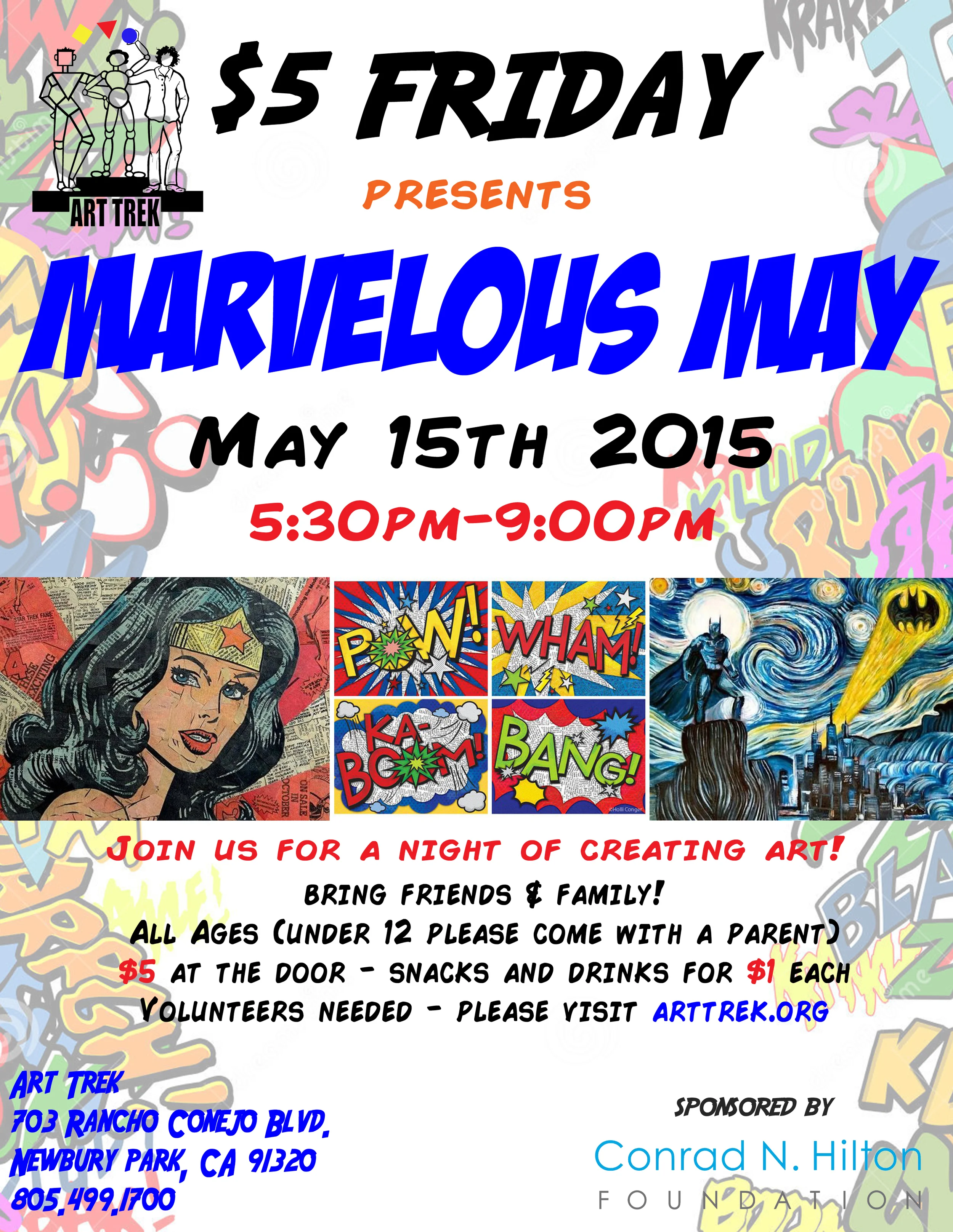 Marvelous May is THIS FRIDAY! Come create your favorite Super Hero, Comic Book, Villainous Creation at our $5 Friday event!This Friday from 5:30-9:00pm$5 Admission Snacks & Drinks for $1If you are interested in volunteering with us, click the link below to Sign-Up! $5 Friday Volunteers WANTED View fullsize Posted on May 11, 2015 by Media Outreach Coordinator and tagged Art Trek $5 Friday Marvelous May Super Heroes Villians comic book.