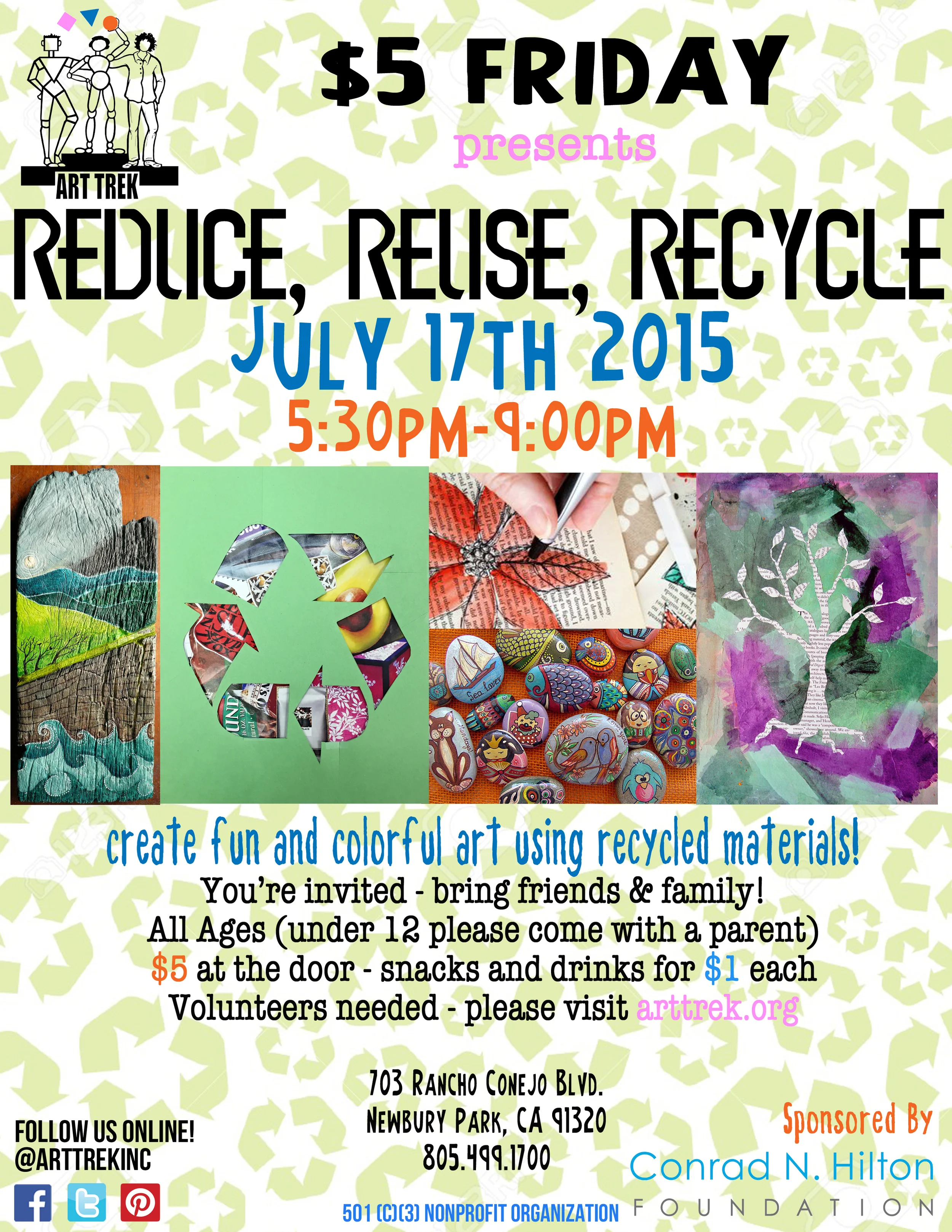 $5 Friday - July 2015! Reduce, Reuse, Recycle View fullsize Interested in volunteering?! Click here Posted on June 26, 2015 by Media Outreach Coordinator and tagged Art Trek $5 Friday July 2015 Recycle Reduce Reuse.