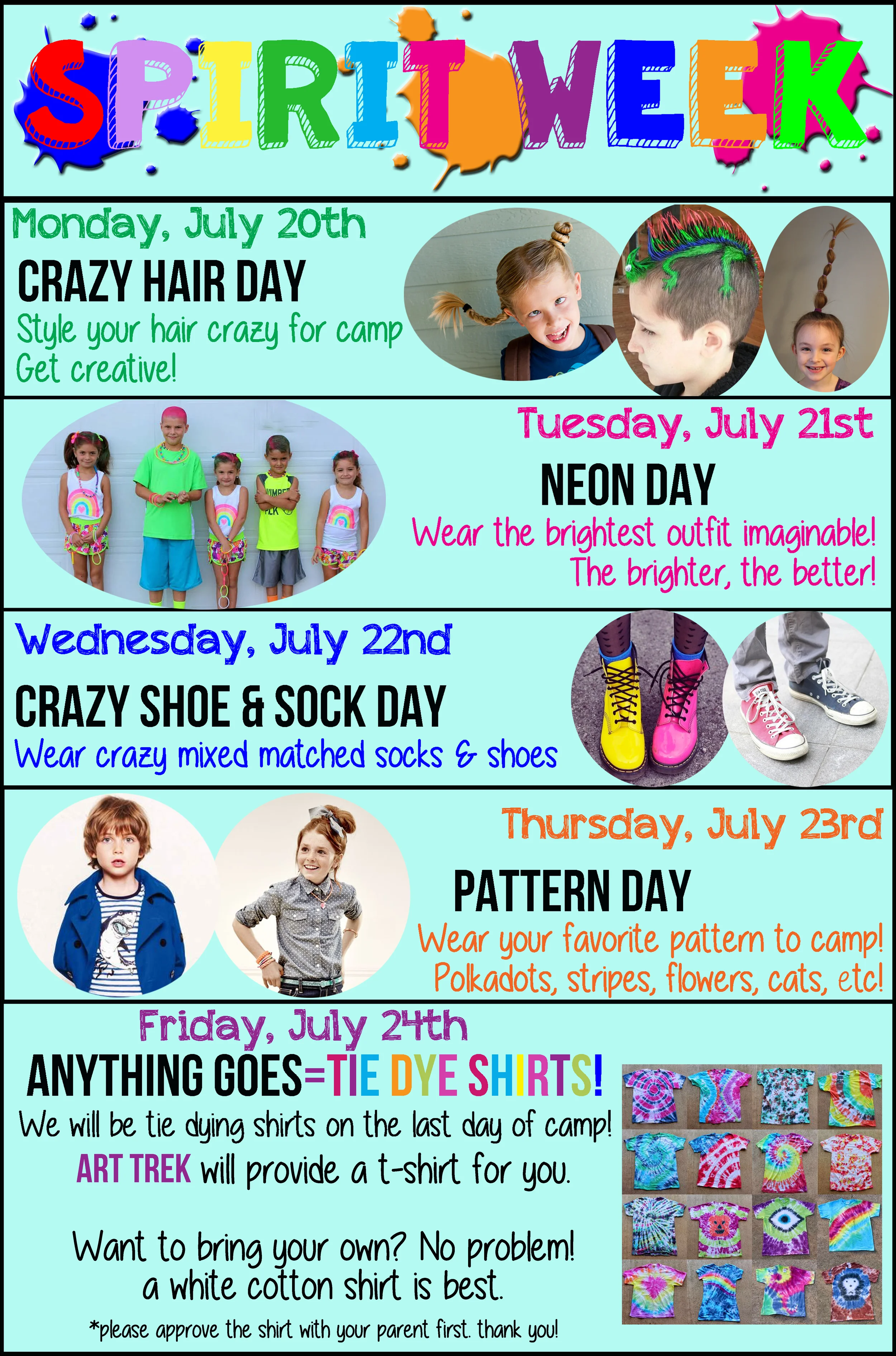 Last Week of Summer Art Camp = Spirit Week! Join us at Art Trek for the last week of Summer Art Camp! We are having a SPIRIT WEEK! Check out the different days below. Don't miss out! Sign-Up Today View fullsize Posted on July 13, 2015 by Media Outreach Coordinator.