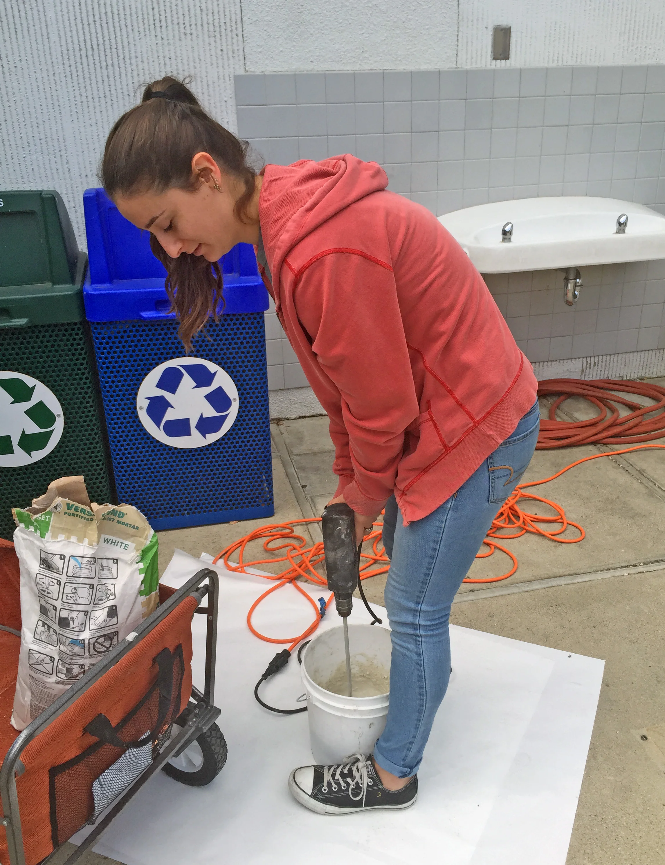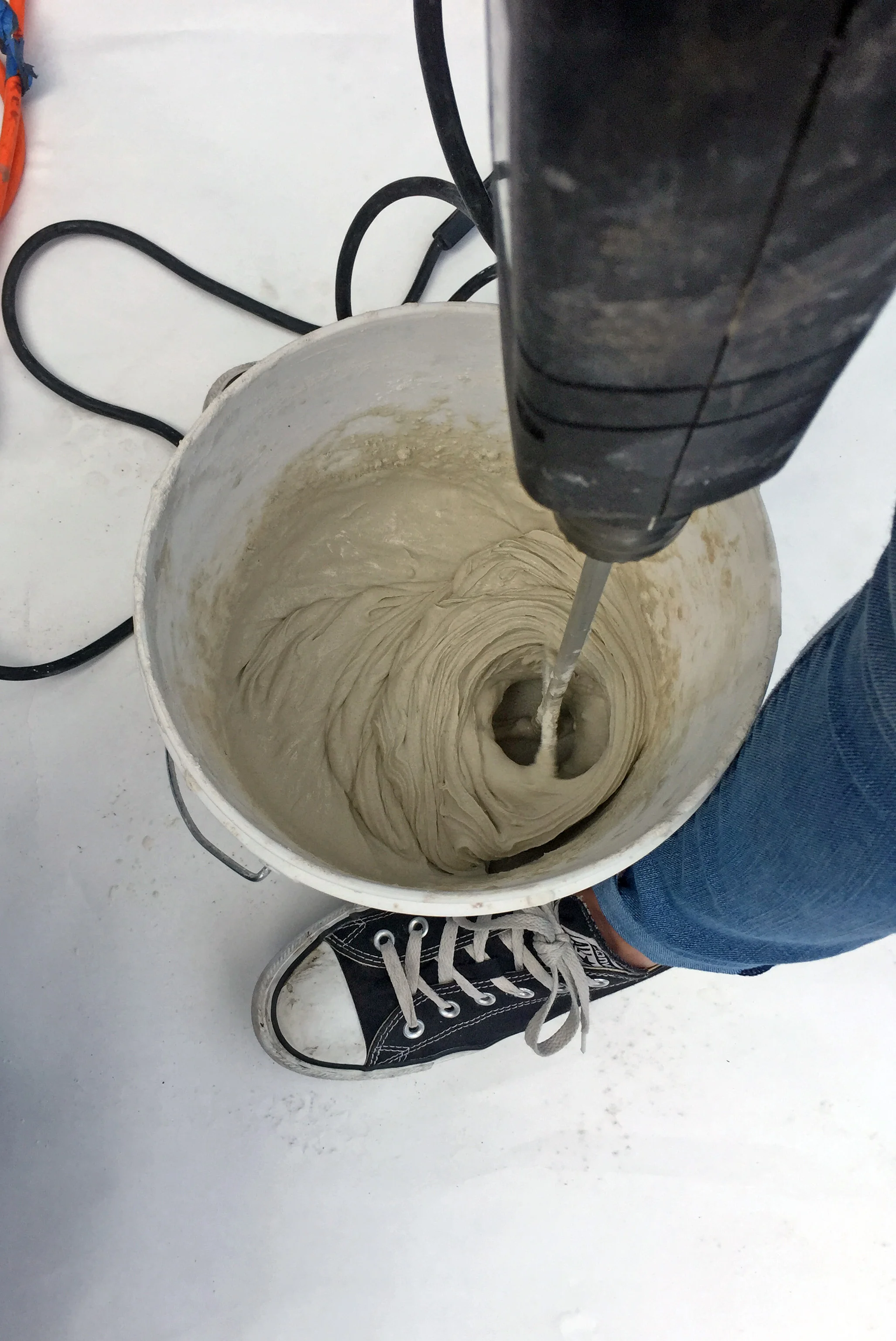 Alissa mixing thinset. Thinset is like a glue, it is used to stick the tiles to the wall!
