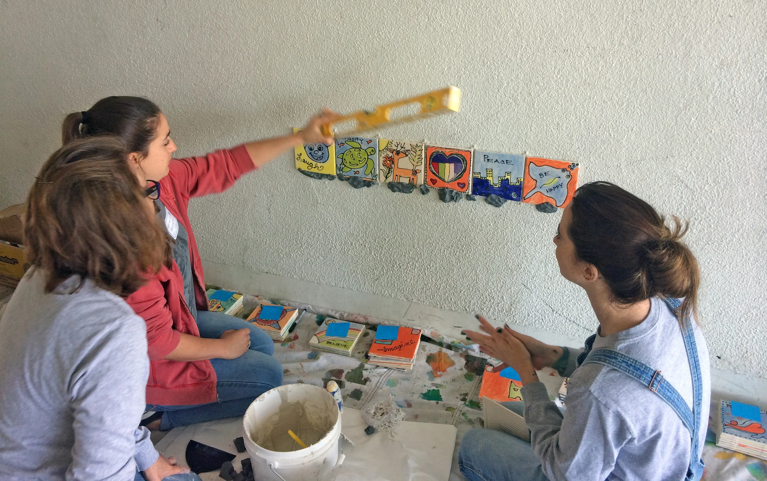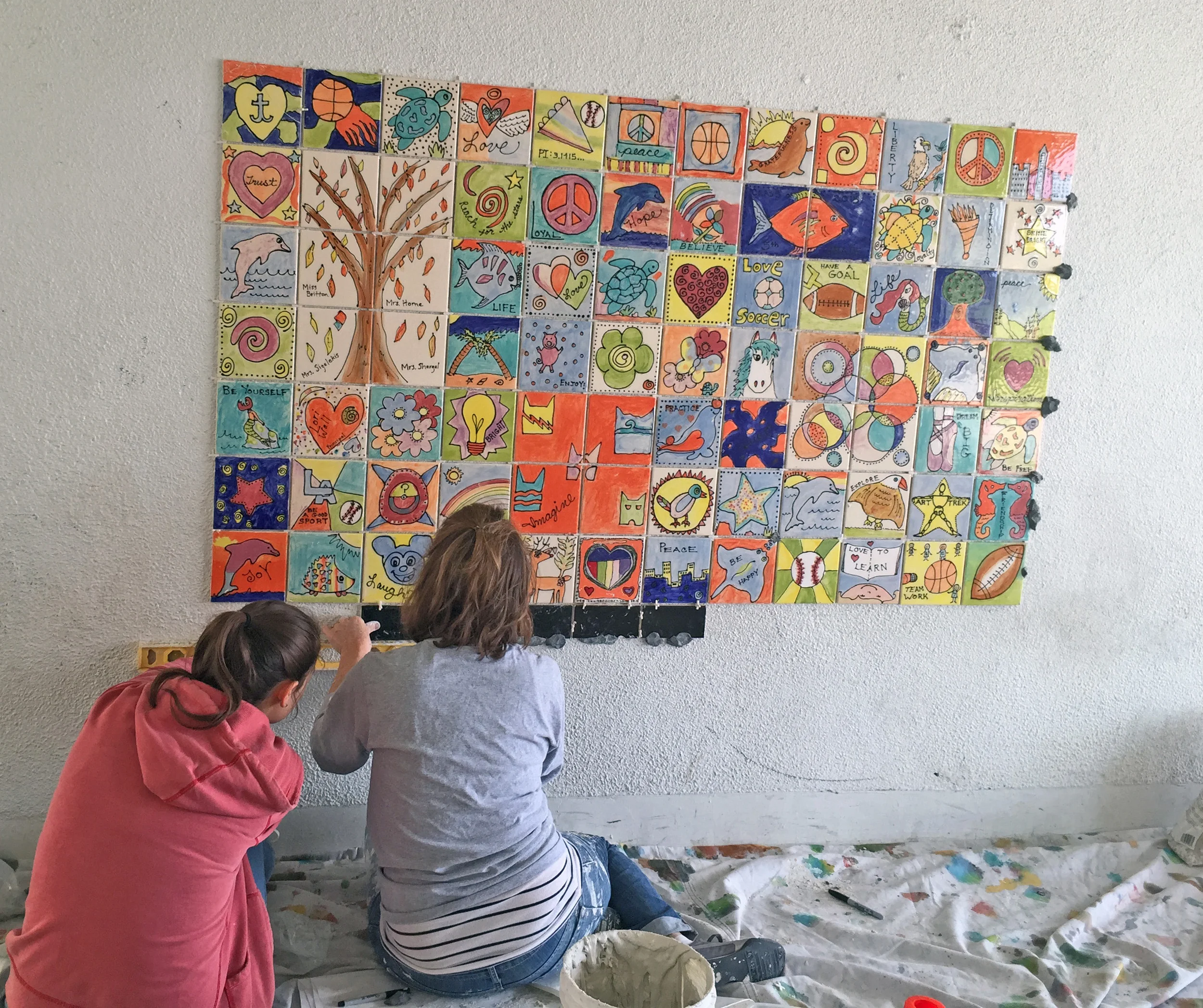 Behind the scenes photos of Art Trek staff putting up Ladera Elementary Character Wall. Amazing job 5th Grade Class!