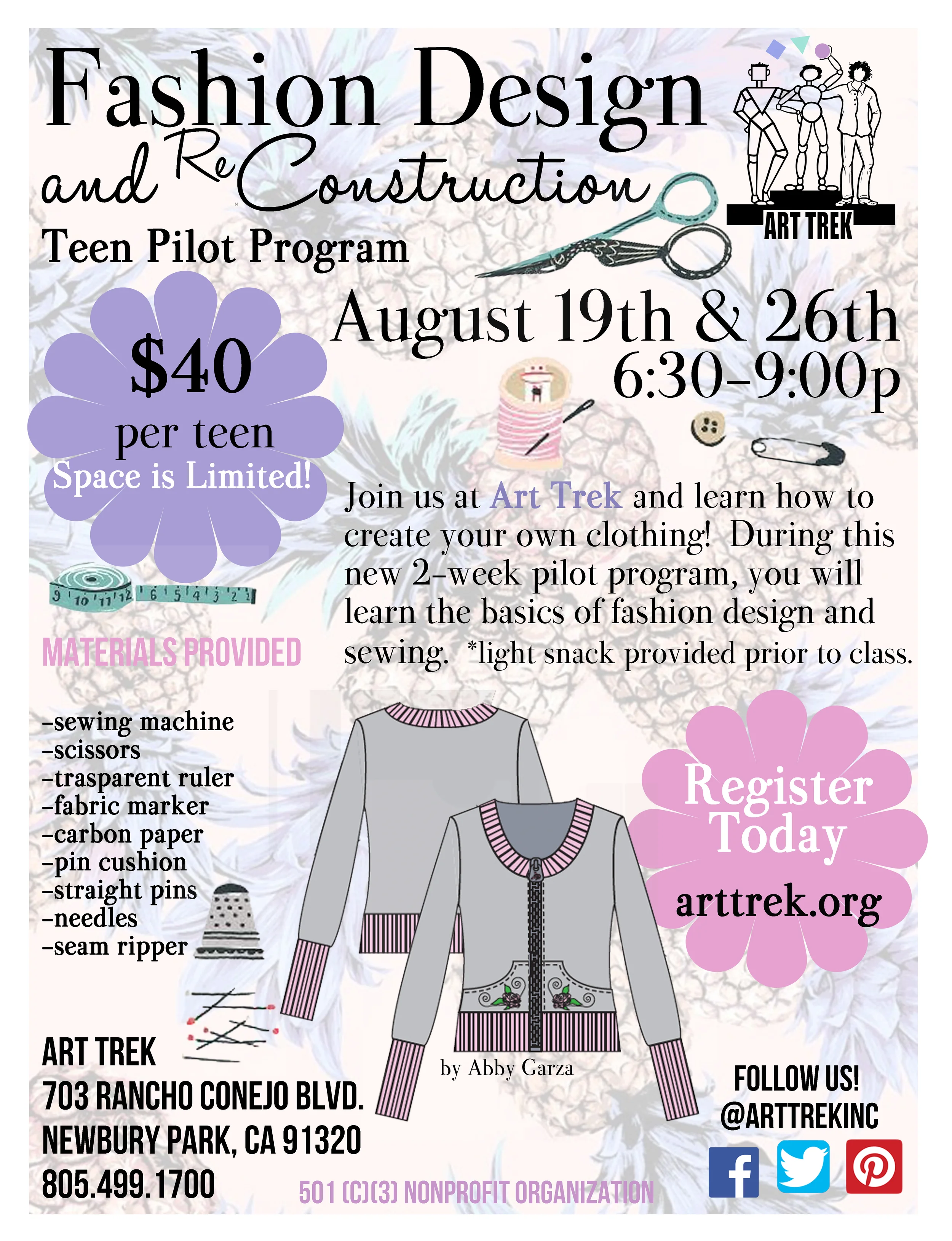 New Teen Pilot Program! Does your son or daughter want to learn the basics of sewing?!Sign them up for our NEW two part class! Sign-Up Today! Posted on August 6, 2015 by Media Outreach Coordinator and tagged Teen Program Fashion Design Sewing Class Art Trek.